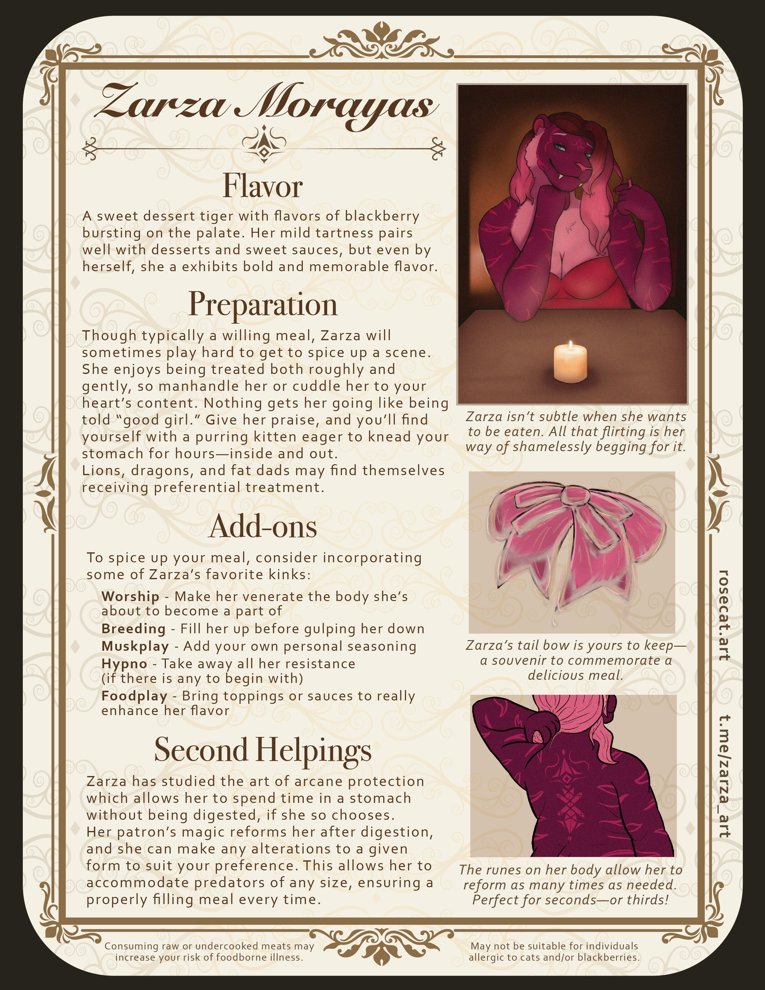 (Bsky: @zarza.rosecat.art; FA: Funyuns; Other: rosecat.art)I will draw any gender and sexual orientation, fat/weight gain, vore (soft/oral only). Basically anything that's in my FA gallery, I'm open to discussion!I will not draw minors, certain fetishes, or illegal/hateful content.